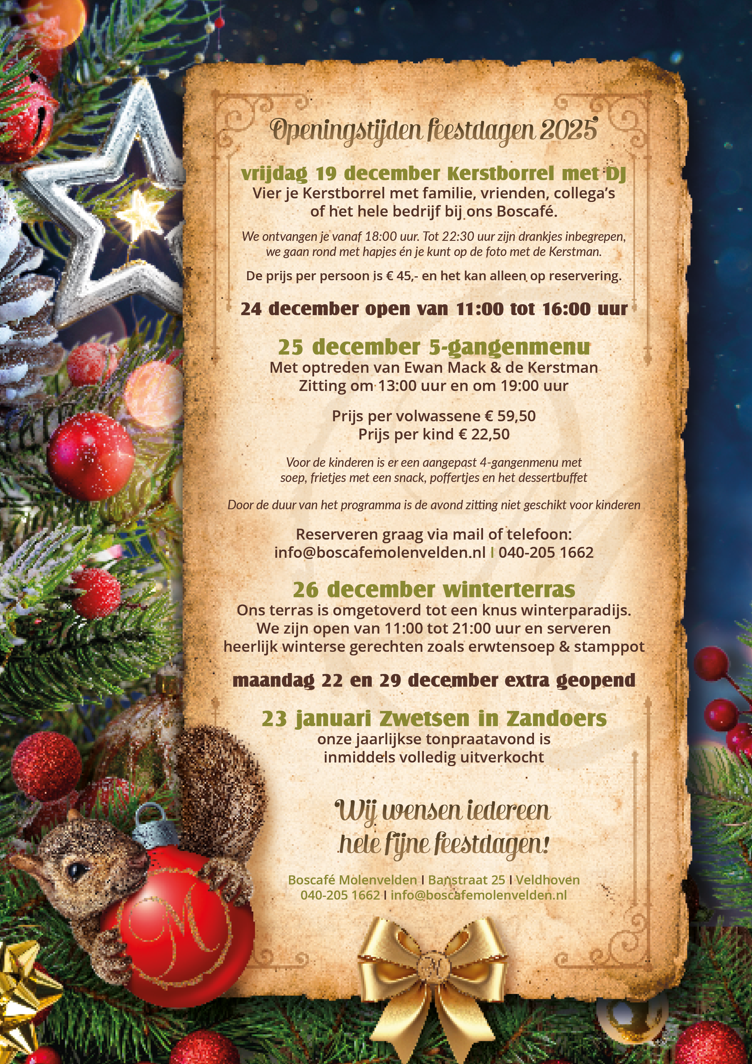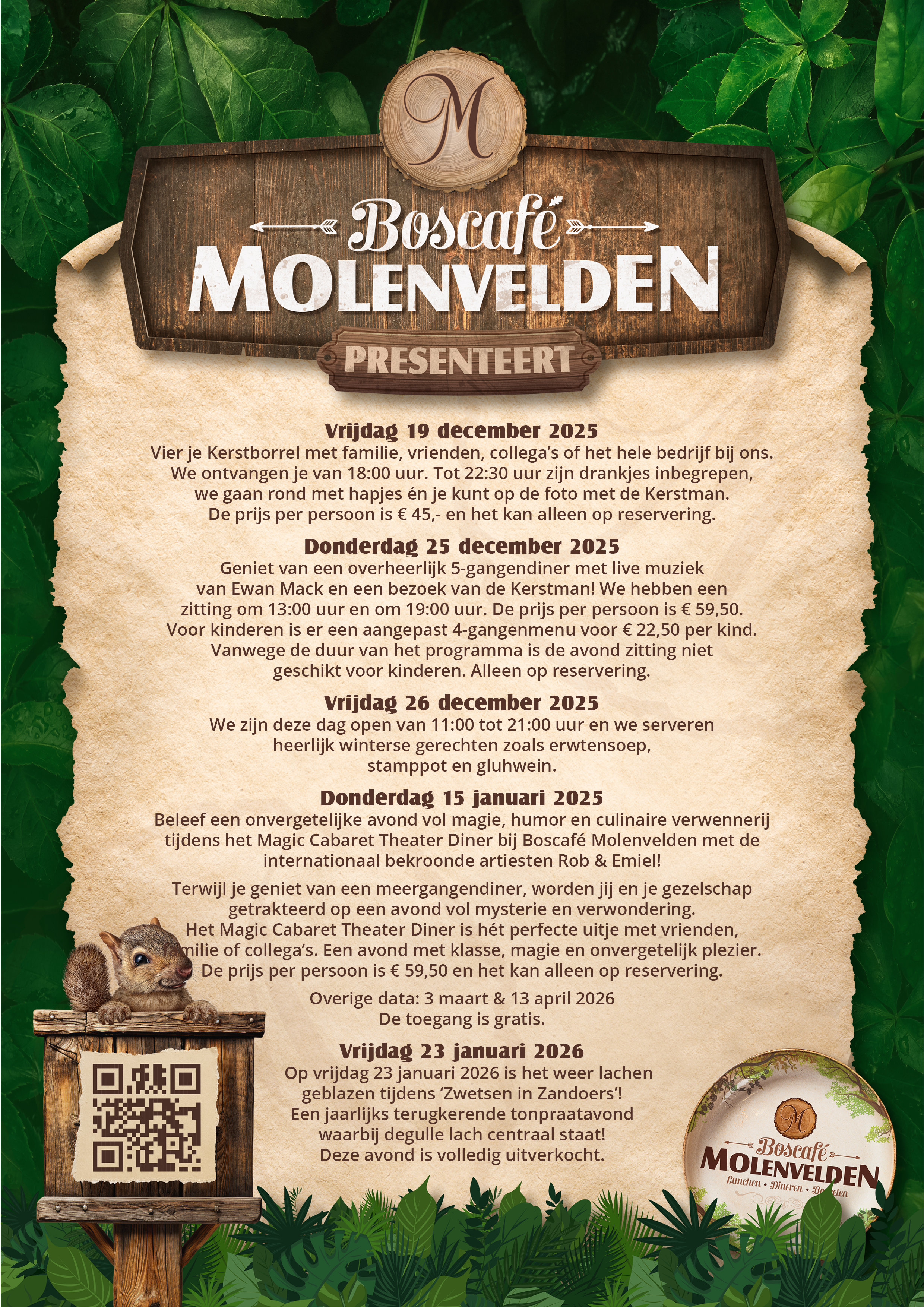 At restaurant Boscafé Molenvelden, you will always find what you are looking for. From tea to trappist beer. From coffee to Cointreau. From starters to steak. From spare ribs to salads.